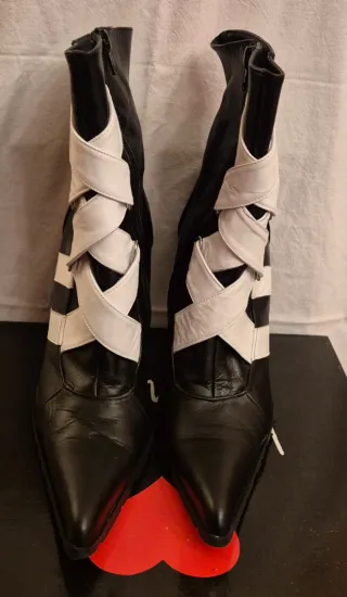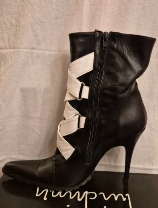 Botines de tacón con un diseño llamativo en blanco y negro. - Material exterior de cuero. - Cierre de cremallera lateral. - Tira decorativa cruzada en blanco con. velcro para ajustarlo más, si se desea - Cómodos - Tacón 11'5 cm. - Caja original
