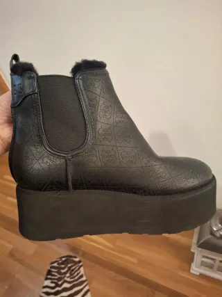 Botines originales de la firma Guess con un diseño estampado. - Estampado de monograma Guess. - Forro interior de pelo sintético. - Suela de goma. Botín de piel lisa con logotipo triangulo, con suela de goma amortiguante con forro de peluche en el interior y altura de la plataforma de 6 cm. Talla: 36 Poco uso ¡Impecables!.