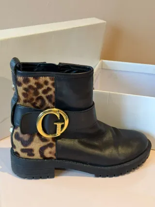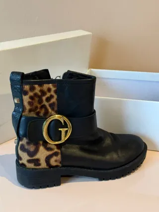 Botines Guess con un diseño moderno y llamativo. - Combinación de cuero negro y estampado animal. - Hebilla dorada con el logo G de Guess. - Detalle de tachuelas en la parte trasera. - Suela gruesa y resistente.