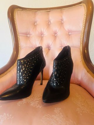Botines en 100% piel de la firma ‘Guess’. Acabado en punta. Elástico y cierre lateral con cremallera. Se aprecian imperfecciones en los tacones. Tacón medio 7 centímetros. Muy cómodos. Número: 38