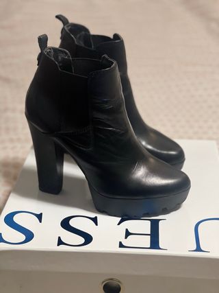 Botines de tacón alto con plataforma. - Diseño elegante y moderno. - Cierre lateral elástico. - Tacón grueso para mayor comodidad y estabilidad. 37. Se usaron para una fiesta unas horas y al estar guardados se ha deteriorado el forro interior, los exterior está impecable.