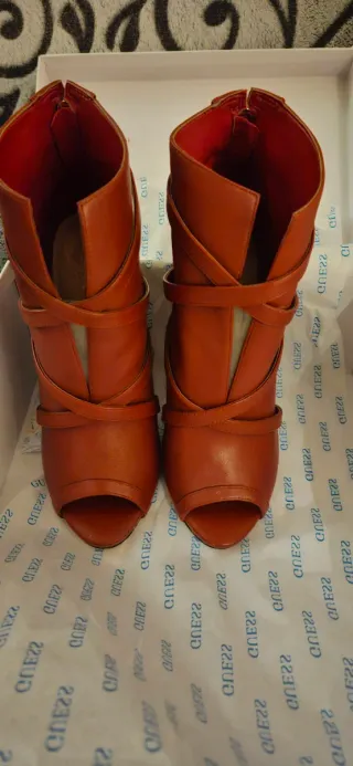 Botines de tacón Guess en color rojo, con un diseño moderno y elegante. - Material exterior tipo ante. - Tacón de 11 cm - Punta abierta (peep toe). Sólo los he usado una vez pero la suela está muy sucia de ahí su precio. Por dentro están nuevos