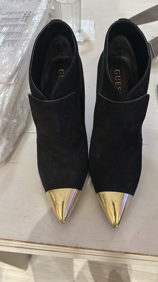 Elegantes botines de la marca Guess. - Diseño en ante negro. - Puntera metálica dorada. - Corte moderno y sofisticado.