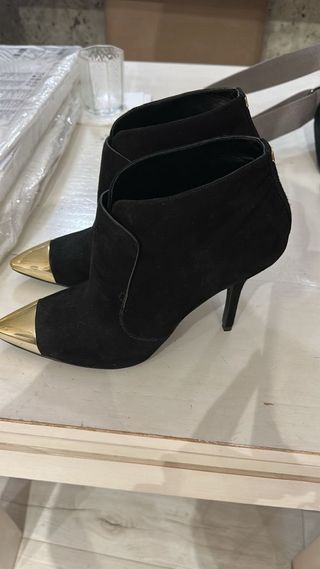 Botines de ante negros de la marca Guess. - Tacón alto y grueso. - Detalle dorado en el talón.