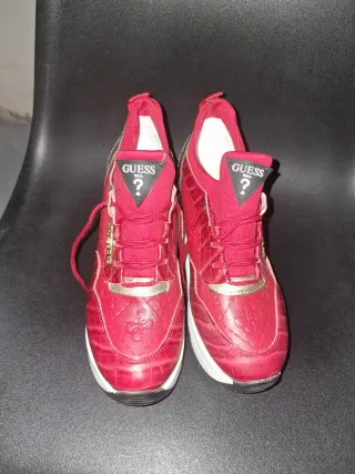 Botines Guess con un diseño moderno y llamativo. Usado una sola vez - Color rojo con detalles dorados. - Acabado texturizado. - Suela blanca y gruesa.