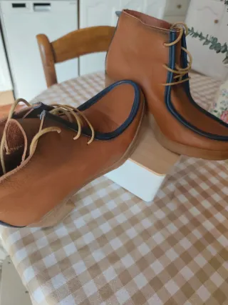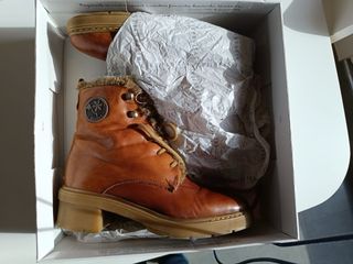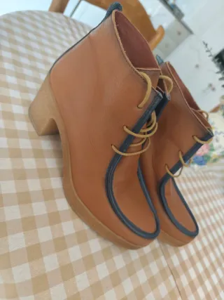 Botines de cuero con un diseño elegante y detalles cuidados HISPANITAS 38 -color marron o camel -tallan bien 38 - Cierre con cremallera y cordones. -en su caja original -cordoneras repuesto /ver fotos/ - Forro interior de pelo. - Adorno circular con logo en el lateral. - Tacón grueso de madera.