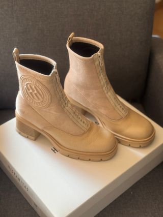 Botas de la marca Hispanitas en color beige, con un diseño moderno y elegante. - Cierre de cremallera frontal. - Detalle de logo circular en relieve en el lateral. - Tacón bajo y suela de goma. - Materiales de calidad.