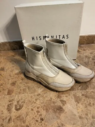Botines de la marca Hispanitas en talla 36. Un calzado versátil y con estilo. - Combinación de materiales en tonos beige y marrón. - Cierre lateral con cremallera. - Detalle de cordones y adornos metálicos. - Suela de goma que se agarra muy bien. No resbalan. - Logo de la marca en la parte posterior de la suela.