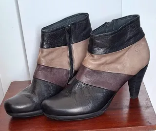 Botines de la marca Hispanitas en piel de la talla 40. Presentan un diseño tricolor combinando el negro con el marrón y el beige. Tienen poco uso, ver fotos de las suelas. Puedes verlos y probarlos sin compromiso alguno. - Combinación de negro, beige y marrón. - Cierre de cremallera lateral.