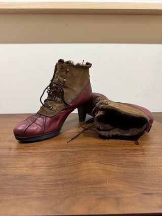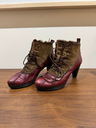 Botines de la marca Hispanitas en talla 40. - Combinación de colores marrón y rojo. - Diseño con cordones y detalles de pelo. - Tacón alto.