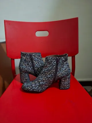 Botines de la marca Hispanitas con un diseño moderno y llamativo. - Acabado textil con mezcla de hilos. - Tacón cuadrado y robusto. - Cierre de cremallera lateral.