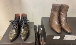 Lote de 2 pares de Botines de piel con tacón medio. Un diseño elegante y versátil. Hispanitas y Patricia Miller - Acabado metalizado. - Cierre con cordones y lazo. - Punta fina.