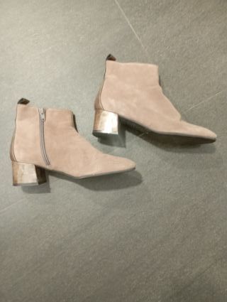 Botines de ante en color rosa nude, talla 35. - Tacón metálico. - Cierre de cremallera lateral.