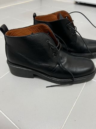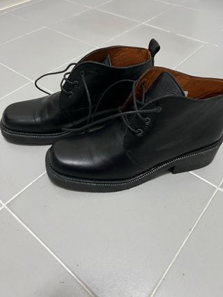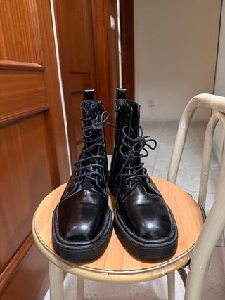 Botines de piel en color negro. No veo la talla, pero será como un talla 37, yo uso un 38 y me aprietan.Un básico versátil para cualquier ocasión. - Material exterior: Piel. - Cierre con cordones. - Interior forrado en piel.