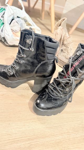 Botines de tacón con acabado brillante. - Cierre de cordones. - Detalle de cremallera lateral. - Suela gruesa.