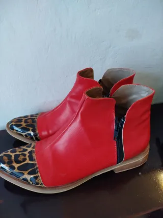 Botines de mujer de color rojo y leopardo. Tiene detalles de uso pero están en buenas condiciones para seguir usándolo. - Punta con estampado de leopardo. - Cierre de cremallera lateral.