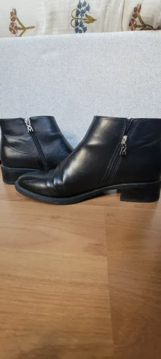Botines de cuero negro Mia Loé, talla 38, 13 cm de caña. Piel lisa en parte delantera y escamosa en parte lateral. Buen estado, un par de usos. - Material exterior de cuero. - Cierre lateral con cremallera. - Diseño tipo botín.
