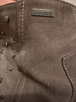 Botines de ante grises de la marca Superdry. Un básico para tu armario. Tiene tachuelas muy bonitas en los laterales externos que le dan un brillo especial. Cierre en la parte del talón. Se ha usado, pero siempre dándole un mantenimiento, suela de los tacones recién reemplazada. - Diseño de botín. - Material de ante.