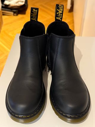 Botines estilo Chelsea de Dr. Martens en color negro. - Diseño clásico y versátil. - Tiradores en la parte trasera para facilitar su colocación. - Suela con el característico pespunte amarillo.
