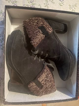 Botines de la marca Homers en color negro, con un detalle de borreguito marrón en el cuello. - Cierre con cordones. - Tacón grueso. - Piel interior - Terciopelo - Borreguito