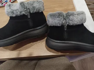 Botines Skechers negros con un acogedor forro de pelo sintético. - Exterior de ante sintético. - Forro interior de pelo sintético gris. - Suela de goma.