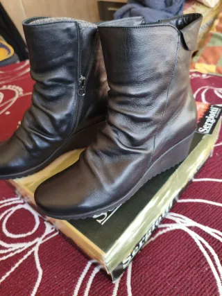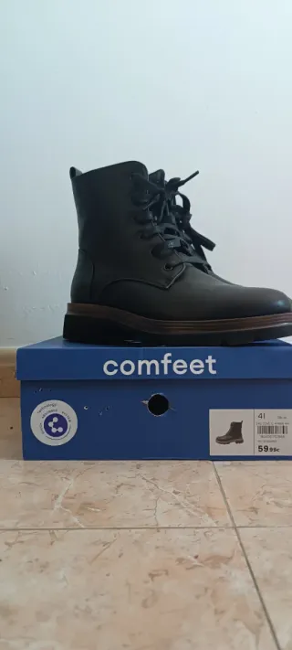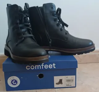 Botín de mujer de la marca Comfeet. - Modelo confort. - Plantilla de piel. - Color negro. - Talla 41. - Diseño de media caña con cordones. Nuevas. Puestas sólo para probar. Las fotos forman parte de la descripción.
