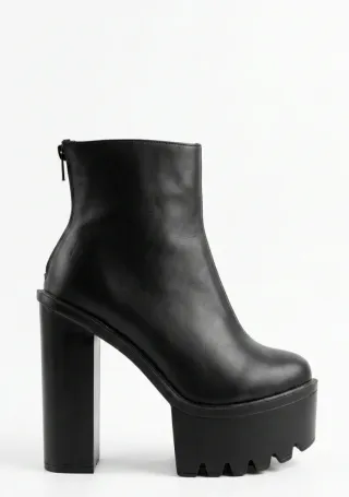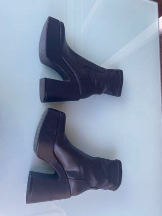 Botines de tacón con plataforma. - Diseño de caña media. - Cierre de cremallera en la parte trasera. - Suela gruesa. - Tacón cuadrado y robusto.