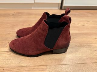 Botines de ante en color rojo burdeos de Bimba y Lola. - Material exterior: ante. - Cierre elástico lateral. - Tirador trasero. Se ha cambiado la suela y por eso no hay logo de la marca.