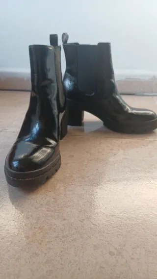 Botines de charol con un diseño elegante y moderno. Perfectos para añadir un toque sofisticado a cualquier atuendo. - Material: Charol brillante. - Diseño: Punta fina y tacón bajo. - Cierre: Elástico lateral para facilitar su uso.