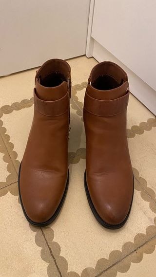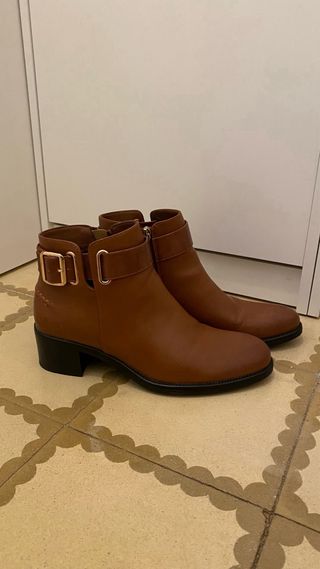 Botines de piel con un diseño moderno y elegante. Perfectos para complementar cualquier atuendo. Usado muy poco.En muy. Buen estado - Cierre con hebilla ajustable. - Detalle de tiras cruzadas. - Tacón bajo.