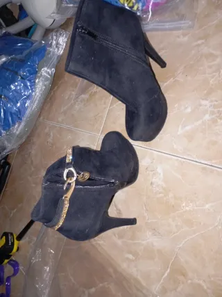Elegantes botines de tacón alto. - Material exterior tipo ante. - Cremallera lateral para facilitar el acceso. - Adorno de cadena dorada con pedrería en la parte superior. No son de marcas están compradas en una tienda de calzado