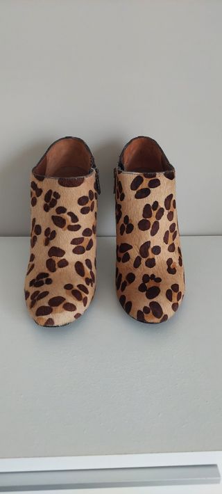 Botines de Zara talla 39. Muy buen estado, usados sólo en una ocasión. Tacón de 10 cm. Cremallera lateral. Estampado leopardo (tiene pelito)