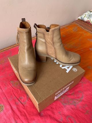 Botines de mujer de la marca Ulanka en color camel. Son cómodos y elegantes. - Cierre de cremallera lateral. - Detalle de ante en la caña. - Tacón cuadrado de 5,5 cm. - Muy poco usadas.