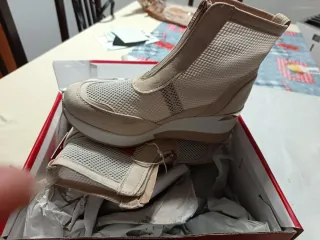 Botines de estilo Converse en color beige y blanco. Son altos y forrados por dentro. - Cierre con cordones. - Suela de goma. - Forro interior de pelo sintético.