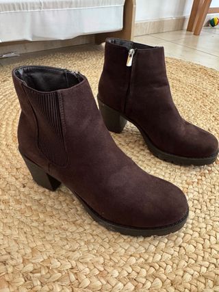 Botines de piel (serraje) con tacón, puestas 2 veces, en muy buen estado. Un calzado versátil y cómodo. - Material exterior: serraje. - Diseño tipo chelsea. - Tacón con forma cuadrada.