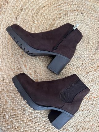 Botines de estilo chelsea en color marrón chocolate. Son cómodos y versátiles. - Material exterior de ante. - Cierre lateral con cremallera. - Detalle elástico en los laterales.