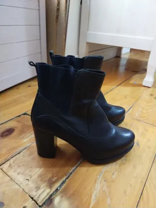 Botines negros con tacón de plataforma. Un diseño moderno y cómodo. Poco uso - Tacón grueso y cuadrado. - Detalle elástico en los laterales. - Suela con relieve.