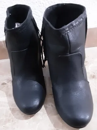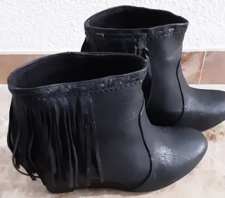 Botines de tacón con cuña y detalle de flecos. Creo que eran de Marypaz. Son del número 39. El tacón es tipo cuña y mide unos 8 cm, medidas en fotos. Material: Imitación piel. No tienen cremallera, son cómodos de poner. Diseño moderno y llamativo. Hago envíos.