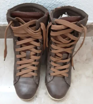 Zapatillas deportivas de caña alta con cuña interior. Del número 39. Tienen tacón interior, tipo cuña. Por fuera es como zapatilla de deporte, con cordones. Imitación piel, color marrón. Medidas en fotos. Es como un botín deportivo. - Color marrón. - Cordones marrones. - Detalle de costuras. Hago envíos.