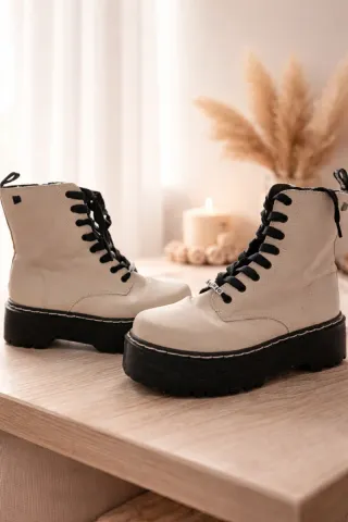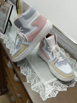 Zapatillas de botín con un diseño moderno y juvenil. - Combinación de colores pastel y blanco. - Cierre con cordones blancos. - Suela de plataforma.