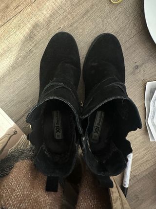 Botines de gamuza en color negro. - Material: Ante / Antelina. - Diseño de botín. - Tacón grueso. - Usado pero en buen estado - Tienen un poco de polvo - Buen agarre en el tobillo - Perfecto para elevar tu outfit