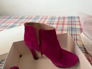 Preciosos botines de terciopelo color burdeos, fucsia talla 37. Ideales para darle un toque de estilo a tus looks de otoño-invierno. - Son de terciopelo, un tejido suave y elegante. - Tienen un diseño de caña corta y tacón bajo. - Son de color burdeos intenso.