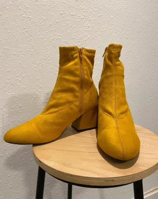 Botines de estilo moderno con un llamativo color mostaza. Perfectos para añadir un toque de color a tus outfits. - Tacón bloque para mayor comodidad y estabilidad. - Diseño tipo calcetín que se ajusta al tobillo. - Acabado tipo ante. -Botin calcetin efecto ante. Usados dos veces( literal),en perfecto estado,el único defecto( imperceptible) se ve en la última foto. Tacón muy cómodo de 7 cm,15 cm de caña.