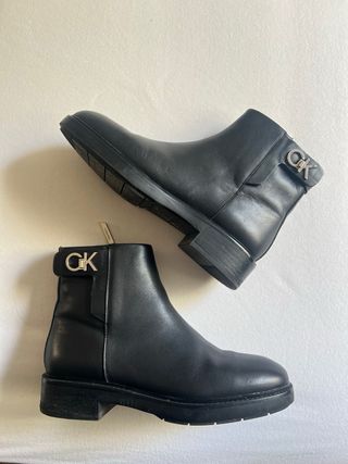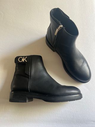 Botines negros de Calvin Klein con detalle de logo. - Diseño moderno y versátil. - Cierre de cremallera lateral. - Detalle metálico con logo 'CK' en la parte superior.