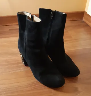 Botines de ante negros con un diseño moderno y detalles de tachuelas doradas en el talón. - Material exterior de ante. - Detalle de tachuelas doradas. - Cierre lateral con cremallera.