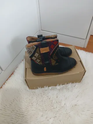 Botines Dolfie con un diseño único. - Parte superior de cuero negro. - Detalle de tejido étnico multicolor en la caña. - Cierre con tira. - Suela de goma.