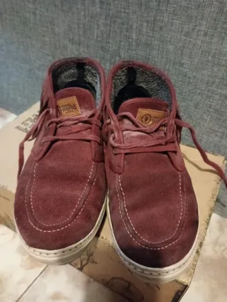 Botines de ante con flecos, un diseño original y cómodo. - Material exterior de ante. - Detalle de flecos en el lateral. - Interior forrado para mayor calidez. - Suela de goma. - Cierre con cordones. Desgastado en la parte del talón pero aún se pueden usar. Color burdeos.