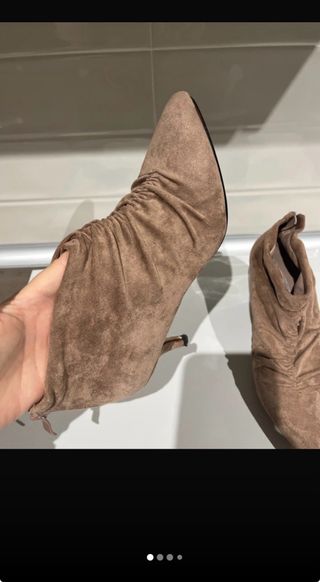 Botines de tacón con acabado en ante sintético. - Diseño fruncido. - Punta fina. - Tacón de aguja.
