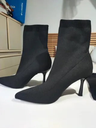 Elegantes botines de tacón para mujer, perfectos para cualquier ocasión. - Material textil elástico. - Punta afilada. - Tacón fino y alto. - Incluye bolsa de tela para guardarlos.