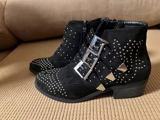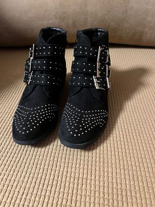 Botines de mujer con tachuelas y detalles de hebillas metálicas. Usada solo dos veces, están en perfecto estado. - Diseño con tachuelas plateadas. - Cierre de cremallera lateral. - Tres correas con hebillas decorativas. - Tacón bajo.